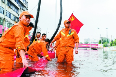 | 7月24日,中韩(武汉)石化应急救援队员在新乡市卫滨区人民路铁西地下道铺设远程供水系统进行排涝。队员们日夜奋战持续作业,历时48小时,抽排水86900立方米,顺利抢通救灾生命线,恢复了正常的交通秩序。 |