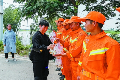 | 7月25日,在卫辉市纪庄桥,热心的志愿者给进行抽排水作业的救援队员送来了热乎乎的烩菜和炒面,表达谢意。 |