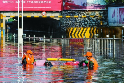| 7月25日,新乡市卫滨区人民路铁西地下道附近,救援队员在深水中铺设远程供水系统,以便开展排涝操作。 |