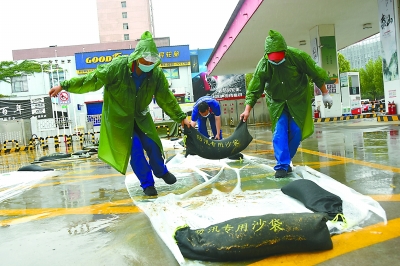 7月28日至29日,台风“烟花”给山东部分地区带来暴雨、大暴雨、特大暴雨。胜利油田、齐鲁石化、济南炼化、山东石油等驻鲁企业积极备战,启动应急预案,备好帆布沙袋、吸油毡、雨衣、雨鞋等物资,以最高标准抓好防汛抢险工作。图为山东石油泰山市区第十加油站员工搬运沙袋。李玉军 摄 姜 锋 孙丽颜 罗 龙 文
