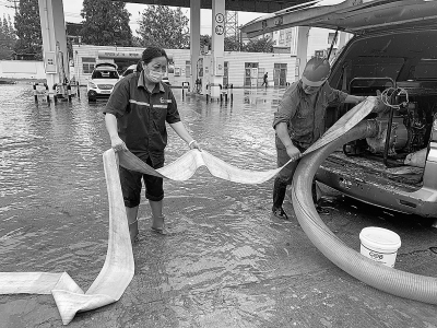 7月27日,江苏苏州石油太仓南郊加油站进水严重。为加快排水进度,该公司紧急调配抽水设备进行排水作业。图为排水现场。陈 倩 摄