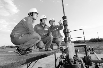 西北油田开展超深短半径侧钻优化技术攻关,为提高采收率提供有效途径。该技术实施以来,平均单井节约成本500万元,钻井周期同比缩短40%。今年以来采用超深短半径侧钻技术让长停井重新上岗。上半年,4口短半径侧钻井完钻投产,平均单井日产能比设计高8吨。图为技术人员分析油井生产效果。胡 强 摄 丁玉萍 吕德群 文
