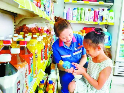 高桂华(左)贴心温馨推介商品,受到小朋友喜爱。廖泽慧 摄