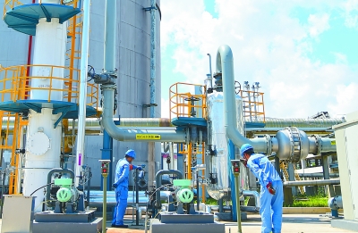 近日,青岛炼化新增污水处理场高浓度废气治理项目成功投用。该项目在现有两套1.6万标准立方米/小时组合式生物除臭装置的基础上,优化管线,新增了一套3000标准立方米/小时高浓度废气收集处理装置,将碱洗、分液后的废气送至动力中心CFB锅炉空气系统进行处理,进一步提升了企业清洁生产水平。图为青岛炼化污水处理场工作人员对高浓度废气处理装置进行设备巡查。刘 强 摄