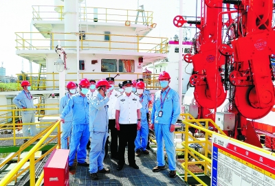 扬子石化码头强化涉外船舶和人员管理,根据海事部门要求,暂时对涉外船只进行停航,对明确需要进入码头作业的涉外船只,成立涉外专班,提升防控等级,所有涉外作业由专班专办。图为8月8日,南京市江北新区涉外联防联控指挥部检查组检查扬子石化码头疫情防控工作,肯定了扬子石化的防疫措施。李 维 摄