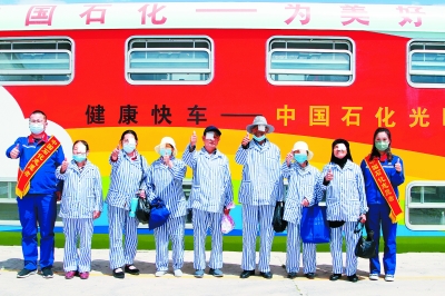 截至8月10日,中国石化光明号健康快车已进驻青海23天,累计为151名贫困白内障患者实施了免费复明手术。这是这列健康快车第四次奔赴青海,将在青海海西州德令哈市、海东市乐都区停靠约3个月,来自武汉协和医院的眼科专家计划在列车上为1000名贫困白内障患者实施免费复明手术。图为白内障患者点赞中国石化。 李桂红 摄 滕宝龙 文