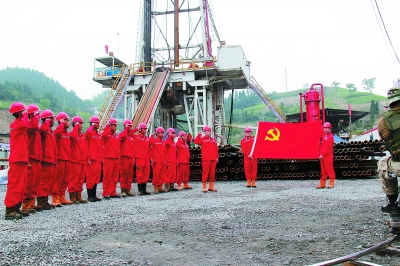 | 钻井二公司西南项目部员工在涪陵页岩气田重温入党誓言,以优异业绩向中国共产党成立100周年献礼。 |