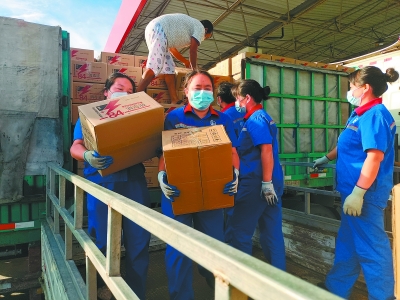 湖南张家界市疫情防控指挥部设置了两个防疫物资运输中转站,茅岩河服务区是其中之一。湖南石油茅岩河加油站位于该服务区,站里员工主动与中转站负责人对接,在保供运输车油品的同时,协助搬运防疫物资,有效缓解人手紧张难题,彰显了央企责任担当。图为8月12日,中国石化员工在协助搬运防疫物资。 张 钧 摄 易文博 朱克胜 文