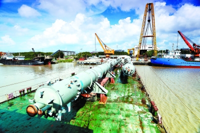 8月7日,炼化工程集团宁波工程公司制造加工的两台塔器在镇海大件码头滚装上船,启运前往俄罗斯,这也是该公司今年交付运往俄罗斯西布尔公司阿穆尔天然气化工综合体(AGCC)项目的首批非标设备。 俄罗斯西布尔公司阿穆尔天然气化工综合体项目,是中俄两国最大的化工合作项目,由中国石化与俄罗斯西布尔公司合作开发,其设计产能为230万吨/年聚乙烯、40万吨/年聚丙烯的装置规模居世界前列。 截至目前,宁波工程公司承接的该项目非标设备共计63台。当日交付启运的两台塔器,直径均为两米,分别是长40.59米、重93吨的脱乙烷塔和长63.10米、重206吨的脱己烷塔。图为两台塔器完成装船。 本报记者 张见明 摄