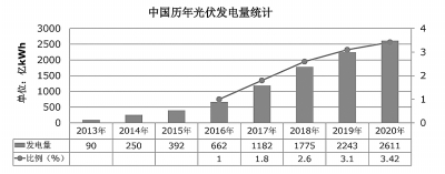 光伏发电量 2019年,太阳能光伏发电量增长22%,在所有可再生技术中,太阳能光伏发电的绝对发电量增长位居第二,略高于风能和水力发电。2020年中国光伏发电量2611亿千瓦时,占比3.42%。 光伏装机容量 2021年上半年新增装机容量1301万千瓦,其中光伏电站536万千瓦、分布式光伏765万千瓦,户用新增装机容量首超集中式,成为新增装机容量主要来源。