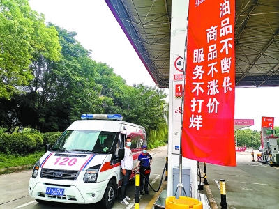 江苏扬州发生疫情后,扬州石油落实“油品不断供、商品不涨价、服务不打烊”承诺,全面做好市场保供工作,为防疫车辆开辟加油绿色通道,助力地方抗疫,当地发生疫情以来提供抗疫用油6500吨。图3为8月15日,扬州石油通宝加油站为120急救车加油。戴 建 摄 陈丽茹 文