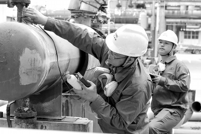 扬子石化邀请第三方专业检测机构,利用装置消缺机会,对特种设备、10年以上老旧压力容器、压力管道、安全阀等开展泄漏专项排查,仔细找出可能存在的微量漏点,及时进行消漏处理。图为8月12日,检测机构人员检测压力容器。达 军 摄