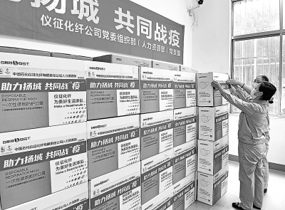 扬州疫情形势牵动人心,为助力扬州抗击疫情,8月13日,仪征化纤公司党委组织部(人力资源部)党支部组织捐赠了3万只公司优质熔喷布生产的“白斯特”口罩,通过邮政速递发往扬州。刘玉福 摄 许海光 文