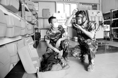 西北油田治安消防中心将每周六定为“车场日”,对应急车辆、装备进行维护保养,让操作员牢固树立“让每台设备健康运行”的意识,切实做好应急执勤备战工作,为油田安全生产保驾护航。图为8月14日,操作员在检验正压式空气呼吸器。 杨东辉 摄 宁耀峰 文