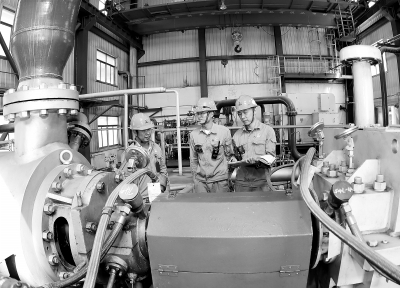 8月份以来,塔河炼化公司抓住成品油销售黄金期,提升原油处理能力,焦化装置生产进入高负荷运行阶段。现场人员强化工艺参数管理,确保操作平稳、产品质量合格。图为8月13日,管理人员在现场讨论高负荷下高压水泵的启动步骤。吴业巍 摄