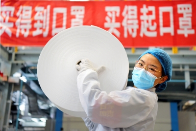 仪征化纤员工在新熔喷布生产线搬运布料。