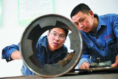 张义铁(左)和同事在一起研究创新课题。
