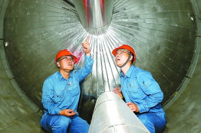 技术人员对C-202低压丙烯回收塔进行质量检查。董 波 摄