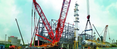 直径8米、高度22米、重量170吨的C-105氧化液提浓塔准备吊装。 杨茂林 摄
