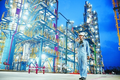 茂名石化员工夜间认真巡检生产装置。