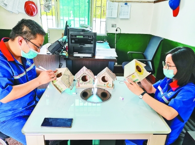 日前,贵州六盘水石油滥坝油库组织员工开展爱心筑巢行动,为鸟群提供栖息的场所,避免它们在库区乱搭鸟巢给油库生产带来安全隐患。油库员工充分发挥聪明才智,有的在鸟巢上绘画精美图案,有的用碎木屑为鸟巢铺窝。鸟巢制作好后,员工们将一个个鸟巢固定在树上,成为油库一道亮丽的风景线。大图为员工制作鸟巢。小图为员工把鸟巢固定在树上。赵 斌 摄