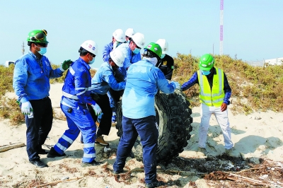 近日,炼化工程集团五建公司沙特贝里油气处理项目部与业主沙特阿美、总包塞班及PMT共同组织开展“海洋文明施工”活动,旨在保护美丽海洋,为绿色低碳发展作出积极贡献。 此次活动以收集清除项目附近海岸废弃物和生活垃圾为主。项目参建人员佩戴防护手套,携带铲子、耙子,积极开展海滩垃圾清理及岸上垃圾处理。 在两个小时内,他们共收集并清除了约一吨的各类废弃物和垃圾。活动增强了员工的大环保理念,彰显出项目团队高严细实的工作作风和公司深入实施绿色企业行动的决心,夯实了项目部与业主阿美、总包塞班的互信基础。 塞班安全主管激动地用“We are a team(我们是一个团队)”对项目部的积极配合表示肯定,沙特阿美安全经理艾里森屡屡竖起大拇指。图为员工合力清理红海滩上废弃的轮胎。王维维 韩育龙 摄影报道
