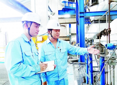 | 师傅夏家骅(右)和徒弟谢学强交流仪表运行问题。 |