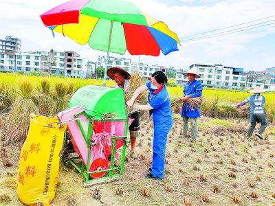 金秋时节,五谷丰收。贵州黔南石油成立助收小队,组织县公司、加油站员工开展送油到田间地头活动,利用休息时间帮助农民抢收水稻,为秋收提供油品和服务保障,受到当地农民广泛好评。图为助收小队成员在黔南州三都县周覃镇新联村帮助农户抢收水稻。陈童花 摄