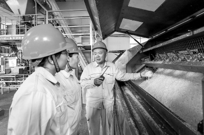 今年以来,南阳能化公司通过严格质量管理,产出客户满意的特种蜡产品,不断提升卧龙牌特种蜡的市场美誉度和知名度。今年前8个月,该公司特种蜡产品销量比计划增长16.8%。图为9月17日,该公司质量检验人员在特种蜡造粒生产线检查产品成型质量。 李家武 摄