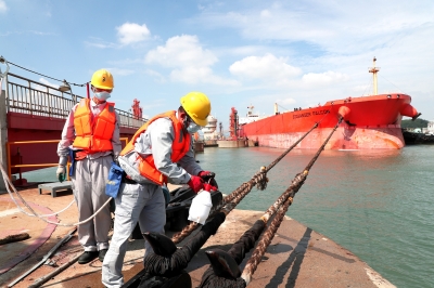 新冠肺炎疫情发生以来,福建联合石化重点抓好人员流动控制、装置安全运行及项目建设、后勤保障等工作,全力以赴战疫情、防风险、保生产。图为9月24日,巴拿马籍油轮靠泊福建联合石化鲤鱼尾码头,码头作业人员对油轮缆绳进行防疫消毒。 肖万元 摄