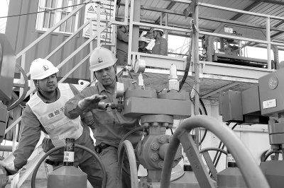 9月27日,西北油田分公司第九届钻井井控技能比武在轮台基地落下帷幕。这是该公司比武首次将赛场设定在施工现场,旨在检验员工真实工况下的应急处理能力,来自河南钻井50131队等8支钻井队伍64名选手参赛。图为9月23日,在顺北801X井现场,江汉钻井二公司90108队参赛人员在节流管汇环节排除故障。汤继超 摄 杜清松 刘红新 文