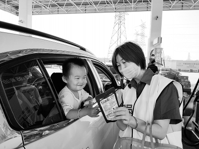 为方便排队加油的顾客购物,安徽淮南石油在国庆期间组织志愿者开展提篮销售,助力易捷商品走出便利店,创效增量效果明显。图为10月1日,淮河大道加油站志愿者向顾客推荐易捷特色商品。宋 晖 摄