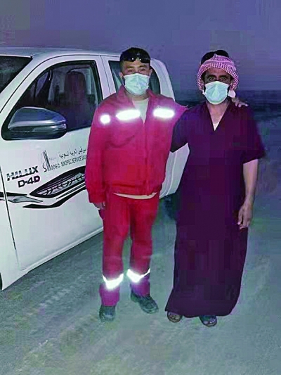 ●张 均 张腾飞 天刚放晴,华北石油工程西部分公司SP276队营房管理员张辉就和司机库达姆一同驱车,前往300多公里以外、地处鲁卜哈利沙漠深处的AMAD-814井场,踏勘道路、查看钻前施工进度。 刚开始,沿途偶尔还能看到交错而过的卡车相互鸣笛打招呼,牧民们的羊群和骆驼在圈中或休息或远眺或进食,远处的井架矗立在天地之间。 随着车辆向沙漠腹地挺近,颠簸的路面让人头晕目眩,扬起的尘土渗入车中,呛得人呼吸困难,耳边只有发动机的轰鸣伴随着车轮碾过地面的沙沙声,手机信号也就伴随着过往的车辆一起消失…… “不好,车轮陷入黄沙中了。” “再踩一脚油门试试!” “嗡——嗡——” 翻过一个沙梁后,张辉突然感觉乘坐的皮卡向下一沉,再踩油门,就只剩发动机的嘶吼及轮胎刨地的吱吱声。下车查看,车轮的一半已陷入黄沙当中。张辉立刻采取石块垫、铁锹挖等方法自救,但车却越陷越深,黄沙逐渐托住了车辆底盘。 在这荒无人烟的地方被困住,真的是叫天天不应,叫地地不灵,手机没信号,就算使用卫星电话联系上井队,但是距离太远,等待救援也不知道是什么时候了。 夜幕即将降临,如果还无法脱困,就只能在这沙漠深处过夜了,张辉想想就觉得后背发凉,而此时他与司机库达姆又已折腾得筋疲力尽。就在这时,他们突然发现一辆墨绿色的越野车从远处的沙丘上驶过。张辉与库达姆立刻飞快地爬上皮卡后车厢,对着远处的车辆大声呼喊,疯狂地挥舞着手中红色工装! “Sinopec(中国石化)?”亮眼的红色工装,引起了对方注意,车上下来一位满脸络腮胡须的沙特籍大叔穆斯塔法,盯着张辉问道。 得到肯定的答复后,穆斯塔法兴奋地介绍说,他侄子也在中国石化工作,并且还多次被评为优秀员工,他见过侄子身穿红色工装的照片。 “没问题!”检查过车辆后,穆斯塔法自信地说。只见他熟练地放掉一些轮胎的气,将托住车底盘的沙子刨出,让轮胎着地,挂上拖车绳,缓慢绷紧。随后两车同时发力,终于将皮卡从沙窝中拽了出来。 穆斯塔法告诉张辉,因为前几天的沙尘暴,里面的道路很多都被黄沙掩盖,很难通行。在穆斯塔法的前车引导下,张辉绕开了这一段危险的路程,历经3个多小时终于行驶上了安全的柏油公路。 张辉将随身携带的、寓意健康吉祥的小葫芦送给穆斯塔法作为纪念,穆斯塔法爱不释手,他更希望和穿着中国石化工装的张辉合影留念。 “咔嚓!”借着车灯的照射,张辉和穆斯塔法在鲁卜哈利大漠深处留下了一张珍贵的合影。