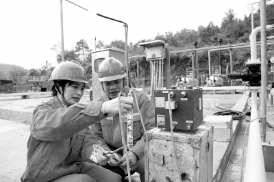 10月20日,涪陵气田首个脱硫试采站——平桥1井脱硫试采站投运,日产气量10万立方米,开启涪陵气田非常规气与常规气共同开采新模式,为气田做好天然气保供和寒武系探明储量申报奠定基础。图为技术员工对气体抽样检查。 李占军 摄 葛梁茜子 文