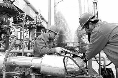 华北油气分公司东胜气田本着早行动、早防范、早落实的原则,全面开展冬季保温工作。针对当地冬季降温快、时间长、气温低的特点,未雨绸缪,有针对性进行冬防保温。图为10月19日,采气二厂天然气处理厂员工对天然气运行装置进行冬防保温。 本报记者 胡庆明 摄 马献珍 文