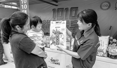 10月10日~14日,安徽池州石油在三县一区6个站点设立易享节活动专区,精选粮油、饮料、副食、酒水、鸥露纸等200多种商品,开展“加一元多一件”促销活动。10月10日,池州石油销售额突破200万元。图为池州石油员工向客户推介易捷商品。孙宗奎 摄