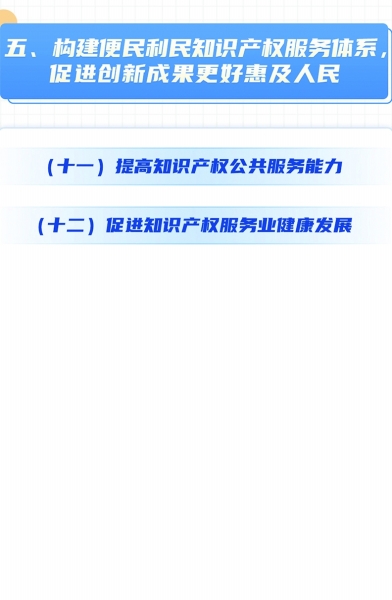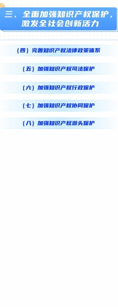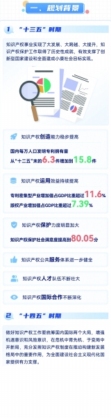 编者按: 国务院日前印发《“十四五”国家知识产权保护和运用规划》(以下简称《规划》)。《规划》明确了“十四五”时期开展知识产权工作的指导思想、基本原则、主要目标、重点任务和实施保障措施,对未来五年的知识产权工作进行了全面部署。本版推出专题,介绍相关内容。 冯 飞 《“十四五”国家知识产权保护和运用规划》为未来五年我国知识产权事业发展绘就了路线图,旨在为知识产权强国建设开好局、起好步。 《规划》明确了“十四五”时期知识产权保护迈上新台阶、运用取得新成效、服务达到新水平、国际合作取得新突破的“四新”目标,以及八项预期性指标。这些指标的设立有何考虑?作为知识产权工作的两个重要环节,知识产权保护和知识产权运用如何实现突破?11月1日,在国务院新闻办公室举行的国务院政策例行吹风会上,上述问题找到了答案。 指标体系 突出高质量导向 《规划》指标体系涉及创造、运用、保护三类八个指标,最重要的特点是体现出知识产权质量和价值导向,这是未来五年我国知识产权工作发展目标的量化体现,对推动和实现知识产权高质量发展至关重要。 国家知识产权局战略规划司司长葛树介绍,《规划》围绕知识产权创造,设置“每万人口高价值发明专利拥有量”“海外发明专利授权量”两个指标。与“十三五”时期相比,“每万人口发明专利拥有量”指标重点突出“高价值”,有利于引导专利从追求数量向提高质量转变。“海外发明专利授权量”指标涵盖《专利合作条约》(PCT)和《保护工业产权巴黎公约》两种申请途径,获得的专利更加全面;同时,从测度申请量转为测度授权量,更能体现创新质量。 围绕知识产权转化运用,《规划》设置“专利密集型产业增加值占GDP比重”“版权产业增加值占GDP比重”“知识产权质押融资登记金额”“知识产权使用费年进出口总额”四个指标。其中,“知识产权使用费年进出口总额”指标不仅体现我国知识产权海外影响力,也体现高质量创新成果引进利用的情况,有利于营造更完善的国际知识产权贸易环境,优化知识产权进出口方式和结构。 葛树介绍,《规划》针对知识产权保护设置“知识产权保护社会满意度”“知识产权民事一审案件服判息诉率”两个指标。其中,“知识产权保护社会满意度”指标反映社会各界对知识产权保护的主观满意程度,有利于引导加强知识产权保护、塑造更优营商环境。 保护体系 构建大保护格局 建设支撑国际一流营商环境的知识产权保护体系,是《知识产权强国建设纲要(2021—2035年)》(下称《纲要》)部署的重点工作。《规划》提出要全面加强知识产权保护,并从完善法律政策体系、司法保护、行政保护、协同保护等方面进行了部署。 “十四五”时期如何推进知识产权保护体系建设?国家知识产权局知识产权保护司司长张志成表示,国家知识产权局将按照《纲要》和《规划》的部署,积极推进知识产权保护体系工程建设。在创新优化保护规则方面,推动商标法修改完善,加快制定商标一般违法判断标准;推进地理标志专门立法;探索数据知识产权保护规则;完善行政保护技术调查官制度等。 健全完善工作体系是建设知识产权保护体系的重要一环。张志成介绍,“十四五”时期,国家知识产权局将严厉打击非正常专利申请和商标恶意抢注等行为,做好源头保护工作;推进跨地区跨部门执法保护协作;有效发挥知识产权保护中心和快速维权中心作用,加强快速协同保护;深入推进维权援助机制建设;深化知识产权纠纷仲裁调解工作;综合运用各种手段构建知识产权大保护工作格局。 “‘十四五’时期,国家知识产权局择优遴选条件具备的地区,开展知识产权保护示范区建设和国家地理标志产品保护示范区建设;同时,深化专利侵权纠纷行政裁决的示范工作,加强知识产权领域信用分级分类监管试点,深化地理标志保护专用标志的改革试点,积极推动把行之有效的改革经验转化为制度机制,提升整体保护水平。”张志成介绍。 权益分配 破解转化难问题 近年来,高校和科研机构专利实施率低的问题比较突出,推进知识产权权益分配改革是激发知识产权转移转化内生动力的重要方式。 国家知识产权局知识产权运用促进司司长雷筱云表示,国家知识产权局从三个方面推进知识产权权益分配改革工作,以解决创新主体和市场主体“不想转”和“不能转”的问题。首先是推动立法赋权。今年6月1日施行的专利法有关条款充分赋予了高校和科研单位知识产权处置的自主权,这可以促进专利的实施和运用。其次是强化政策引导。国家知识产权局会同有关部门相继出台系列政策文件,鼓励完善知识产权转化收益分配机制。再次是开展试点示范。国家知识产权局联合教育部开展国家知识产权试点示范高校的建设工作,首批遴选了清华大学等110所试点示范高校,推动这些学校在知识产权权益分配改革方面先行先试,进一步完善分配政策和激励机制。 “《规划》对推进国有知识产权权益分配改革,完善无形资产评估制度,充分赋予高校和科研院所知识产权处置自主权,推动建立权利义务对等的知识产权转化收益分配机制,完善国有企事业单位知识产权转移转化决策机制作出了一系列重要部署。”雷筱云表示,国家知识产权局将在前期各项工作的基础上,继续做好落实