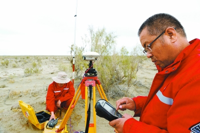 SGC2109队测量项目组在高大沙丘上架设基准站,保证GPS测量信号畅通。陈 俊 摄
