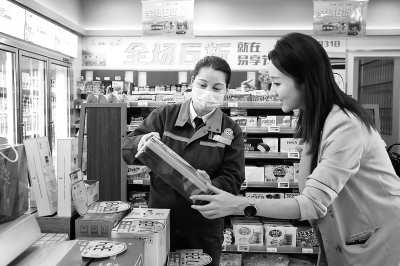 易享节期间,浙江杭州石油秋涛路加油站员工向顾客推介特色商品。龚良奇 摄