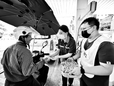 贵州贵阳石油市南路加油站为等候加油客户送上小零食。金旭斌 摄