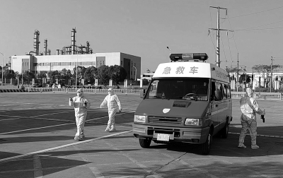 为科学防范和有效应对新冠病毒感染疫情,仪征化纤在储运部危化品接货点举行新冠病毒感染防治应急处置演练,旨在提高防治水平和应对能力,及时控制疫情传播,维护社会稳定,确保公司安全生产稳定运行。图为11月25日,参加演练人员实施区域布控。 刘玉福 摄