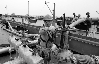 ?巴陵石化储运部优化原油接卸流程,根据油品类型及时调整平卸、收舱阶段的加温时间及阀门开度,安全平稳接卸每一船原油,降低原油途耗,确保原油资源利用效率。图为11月16日,当班员工在原油码头接卸到港原油。 彭 展 摄