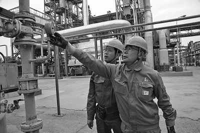 图为齐鲁石化氯碱厂聚氯乙烯车间1号聚氯乙烯装置员工调整设备出口压力。