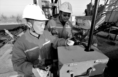 在胜利油田孤岛作业区,油田技能大师牵头,组织技术骨干走进修井现场,对员工遇到的生产难题立项攻关。图为11月25日,技能大师白瑞义(左)指导员工通过使用新研制的卡阻管杆断杆工具解决抽油杆卡钻难题。 王国章 摄 刘玉鹏 王 峰 文