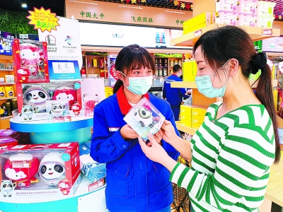 日前,安徽六安石油加油东站便利店开设冬奥会吉祥物商品销售专区,销售摆件、冰箱贴、毛绒玩具、雨伞等冬奥会商品,员工针对顾客需求积极推介,介绍冬奥会商品的寓意、形象来源等,传播冬奥会文化,吸引公众关注冬奥会。图为加油东站员工向客户介绍冬奥会摆件。 王 韡 摄