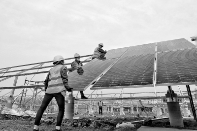 历经2个月紧张施工,齐鲁石化光伏发电项目由土建施工全面进入设备安装阶段。该项目占地13万平方米、装机容量达10兆瓦。目前热电厂与各参建单位协同配合、加快推进,全力确保项目年底前投产发电。图为近日施工人员进行光伏板安装。夏东明 摄