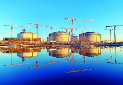 12月2日,天然气分公司天津LNG项目三期工程(一阶段、二阶段)取得天津市发改委核准批复。该项目将主要建设5座27万立方米LNG储罐及配套辅助设施,建成后天津LNG接收站总规模将提升至1165万吨/年,对保障华北地区天然气供应和储气调峰具有重要意义。图为12月4日清晨,正在建设中的天津LNG项目二期工程。 王 军 摄