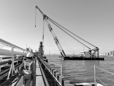 11月27日,随着成品油码头4号化工品输油臂的成功吊装,标志着茂名石化港口分部成品油码头实现向化工型码头转变升级。今年以来,该部抢抓机遇,想方设法优化资源,充分利用现有罐区和码头,新增快上苯乙烯下海装船外运改造项目,全力以赴确保化工产品出厂高效外运,拓市扩销。图为码头化工品输油臂吊装现场。林永胜 摄