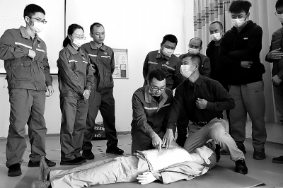 广西梧州石油举办施工作业现场专职监护人集中培训班。培训项目包括规范用火作业、高处作业、起重作业等16项内容。他们还组织学员到应急救援实训考核基地现场观摩学习。图为11月30日,培训班学员进行心肺复苏应急救援实操练习。黎 菲 摄