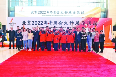 来自北京石油的一线员工与展出的火种灯、火炬、火炬手制服留下珍贵合影,为冬奥会加油助威。